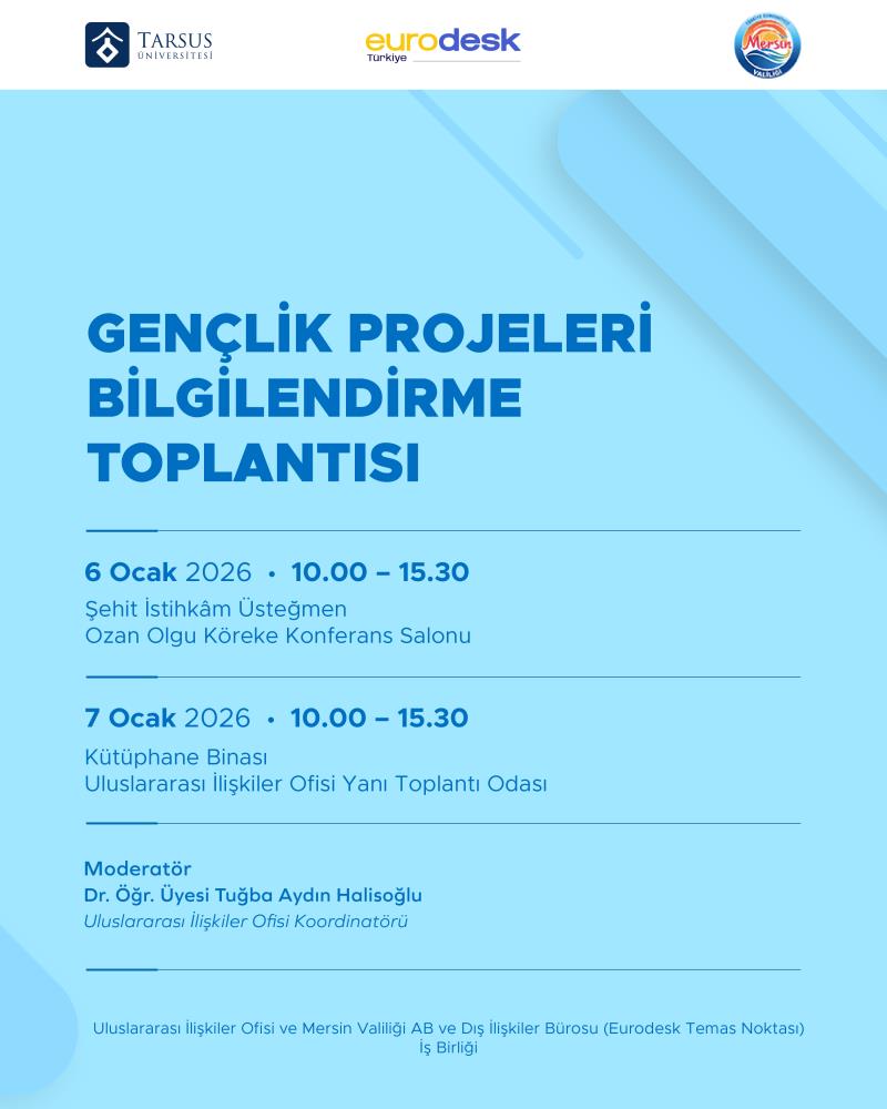 Toplantı, Uluslararası İlişkiler Ofisi ile Mersin Valiliği AB ve Dış İlişkiler Bürosu (Eurodesk Temas Noktası) iş birliğinde gerçekleştirilecektir.